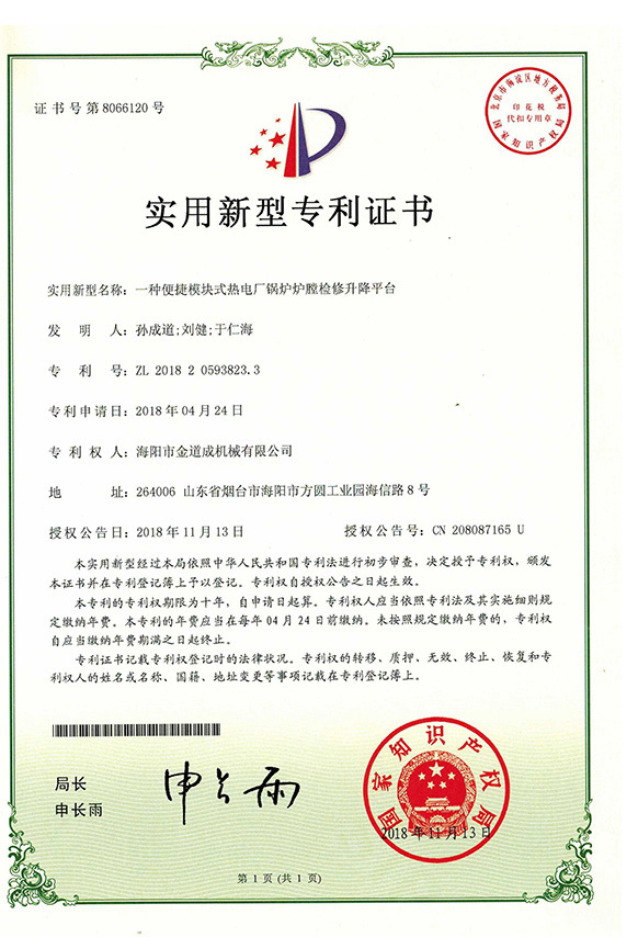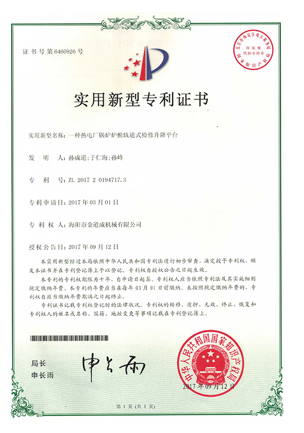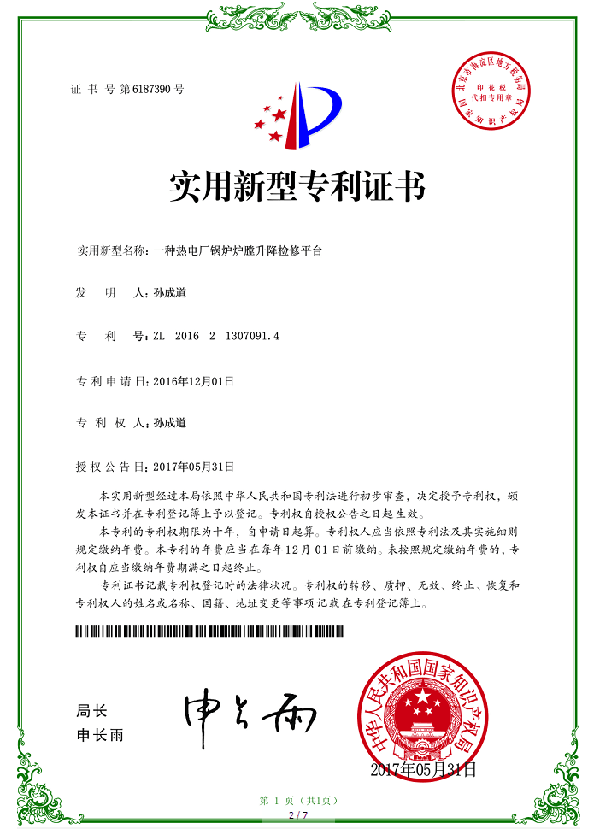 新聞中心下支撐折疊式鍋爐爐膛檢修平臺(tái)行業(yè)首項(xiàng)國(guó)家專(zhuān)利發(fā)明者